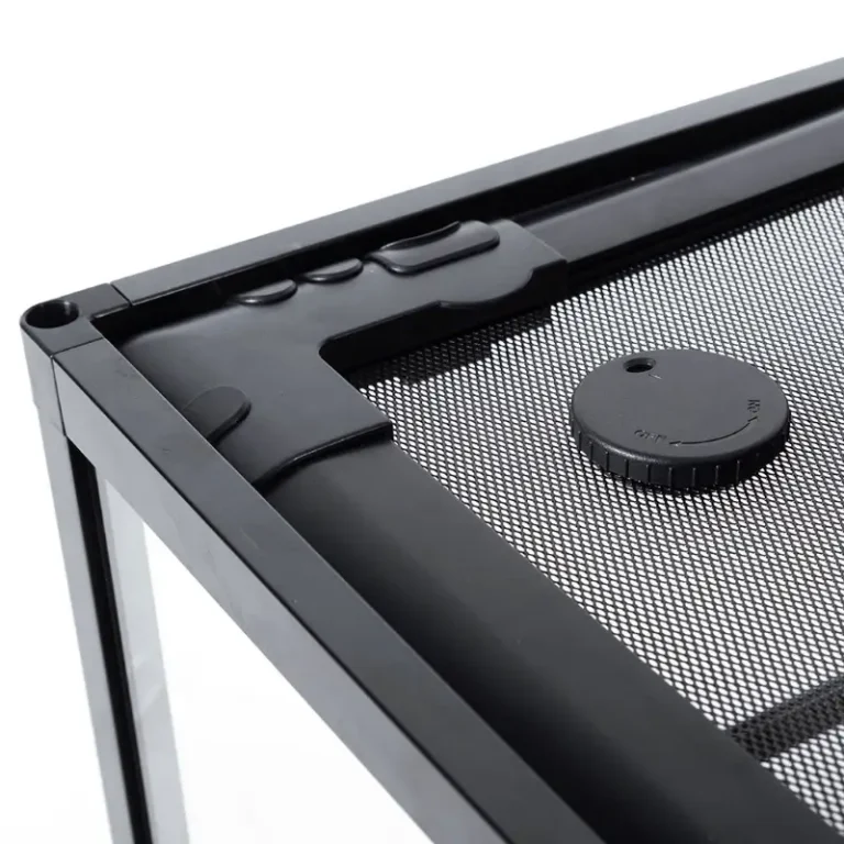 La ventilación superior de pantalla completa permite la penetración de rayos UVB e infrarrojos y es completamente extraíble para un fácil acceso durante la decoración o la limpieza.