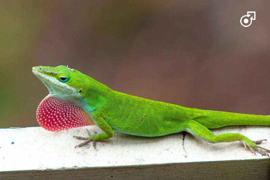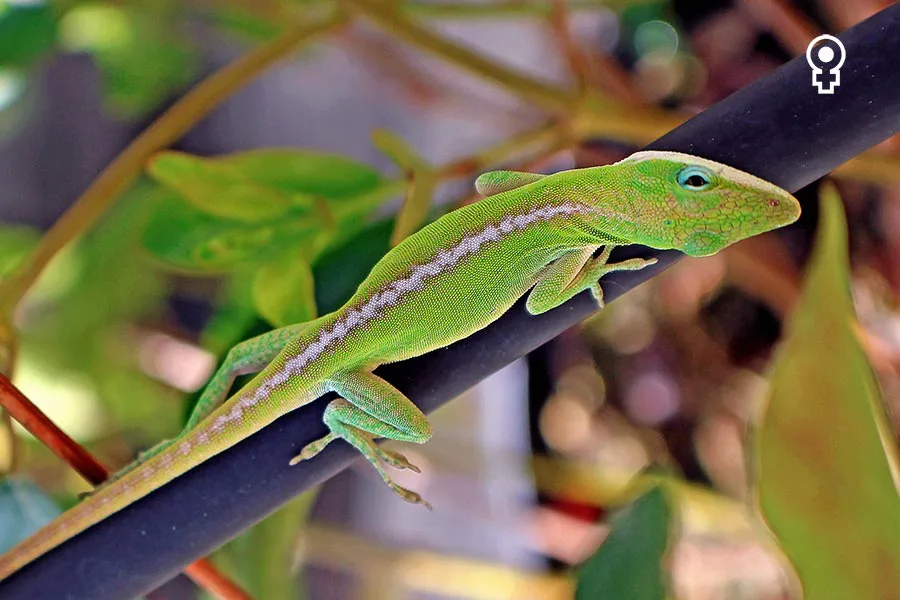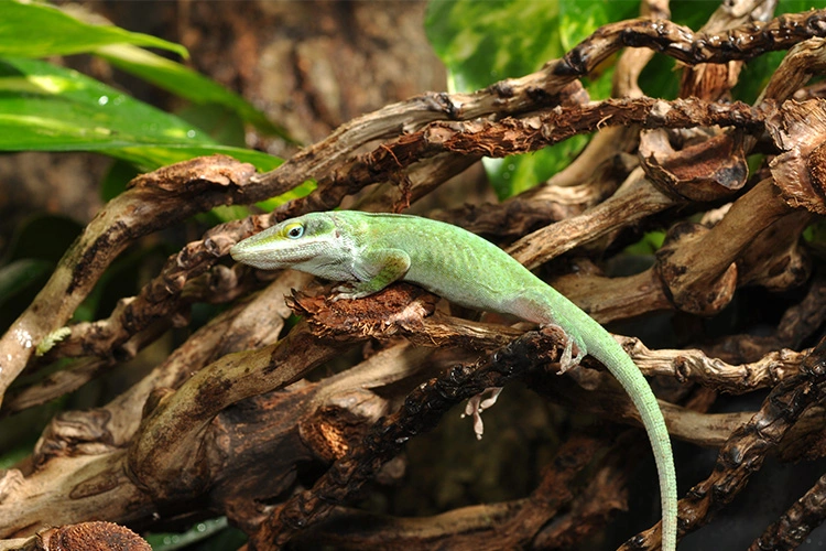 El anole verde (Anolis carolinensis) puede encontrarse en varios tonos de verde o marrón. Las hembras se pueden identificar fácilmente por una franja dorsal blanca que va desde la parte posterior de la cabeza hasta la base de la cola. El anole verde es una especie arbórea y se puede encontrar en su hábitat natural sobre el suelo en las copas de los árboles. Asegúrese de agregar muchas plantas y ramas a su recinto. Como muchos otros lagartos, pueden cambiar de color según su estado de ánimo y temperatura.