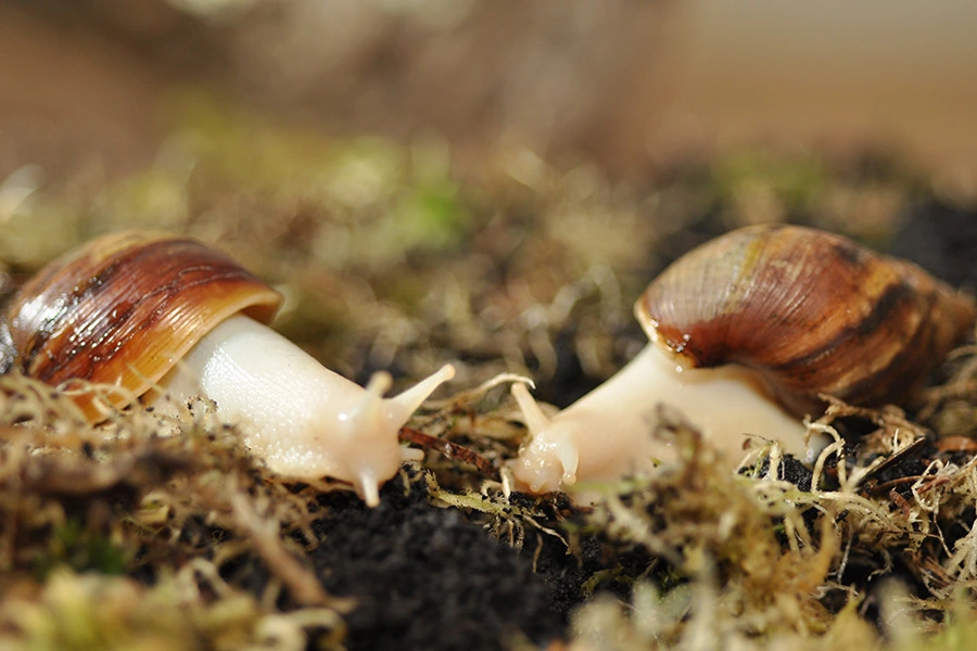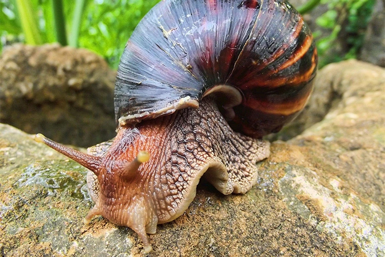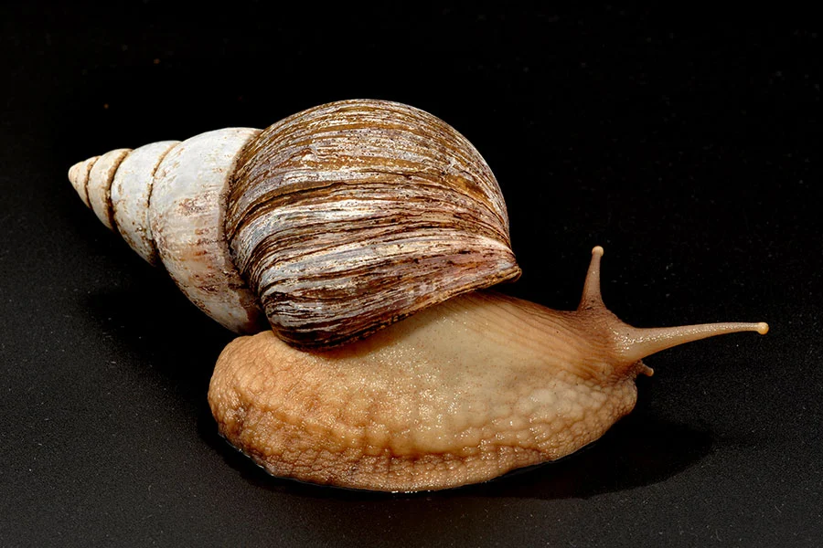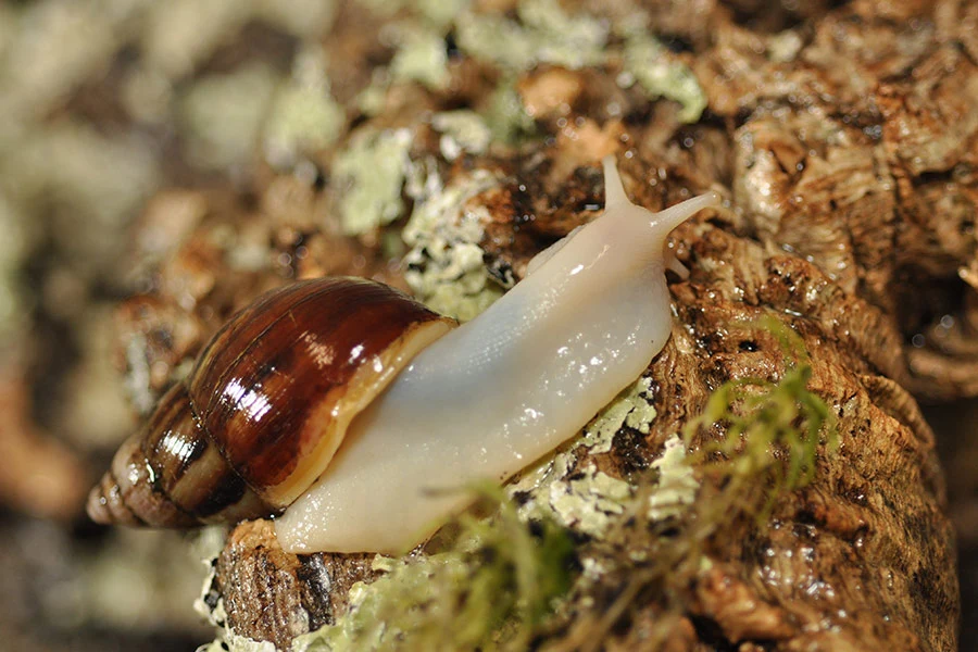 L'escargot géant africain (Achatina fulica) est une espèce de gros escargot terrestre qui appartient à la famille des Achatinidae. Comme son nom l'indique, l'escargot géant africain est une espèce terrestre qui vit sur le sol forestier parmi les débris et la litière de feuilles. En captivité, fournissez un bon substrat humide et de la litière de feuilles dans son enclos. Cette espèce est considérée comme nuisible dans de nombreux pays et est l'espèce d'escargot la plus invasive au niveau international.